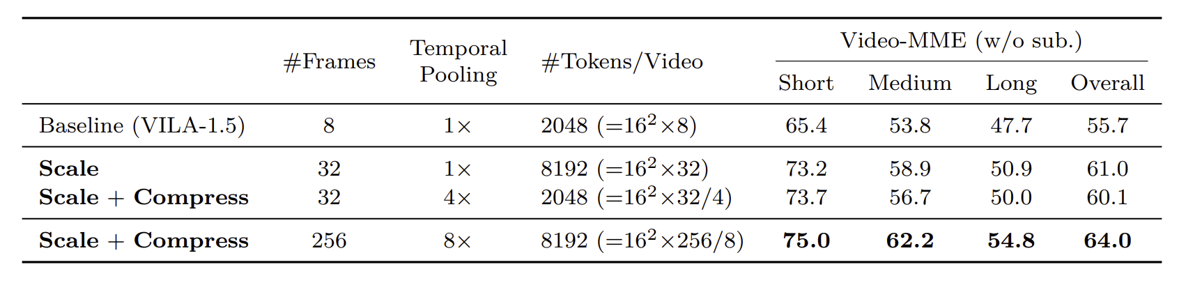 Temporal scaling은 단순히 더 많은 프레임을 선택함으로서 이루어집니다. 이 과정에서 모델이 더 많은 프레임을 처리하도록 video-supervised finetuning(SFT)를 사용하였습니다. 프레임의 수를 8 에서 32만큼 늘려 실험한 결과, 정확도(Video-MME)가 5% 증가했다고 합니다. 하지만 그 만큼 visual token의 수도 4배 증가하였습니다.