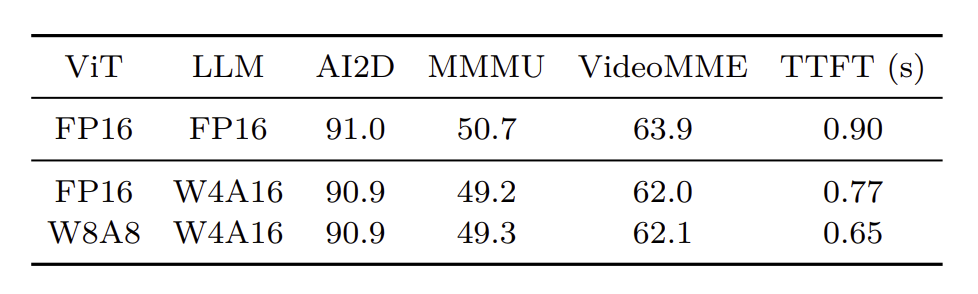 - Prefilling(compute-bounded) : 먼저 token compression으로 LLM의 연산량을 감소시킨 뒤, 병목이 된 vision tower를 해소하기 위해 W8A8 quantization을 적용합니다.