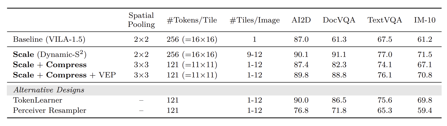 $S^2$는 전체 이미지의 종횡비와 관계 없이 무조건 정사각형으로 tiling하기 때문에 이미지가 왜곡될 수도 있습니다. 이를 방지하기 위해 InternVL 모델의 아이디어를 차용한 $Dynamic-S^2$를 사용합니다. 이는 가장 큰 이미지를 정사각형 tile(e.g. 448 * 448)들로 정확히 나눌 수 있는 가장 비슷한 크기로 축소시킵니다. Visual feature들을 보간으로 합치는 과정은 동일하게 수행합니다. $Dynamic-S^2$를 적용했을 때, 모델 정확도가 30% 향상되었다고합니다([표 1]).