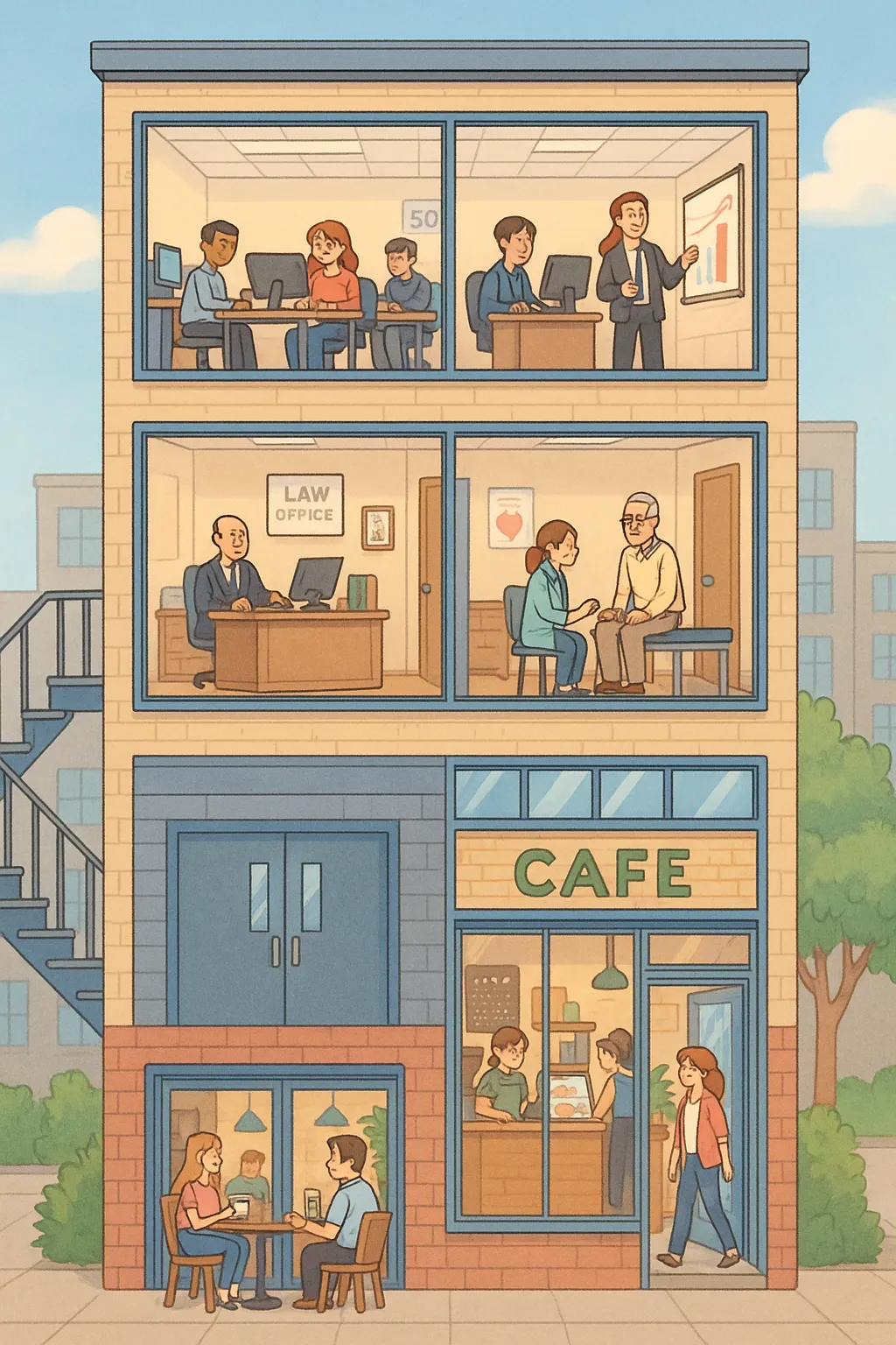 좀 더 쉽게 비유해보겠습니다. 큰 오피스텔이 한 채 있을 때, 각 층마다 다른 업체 또는 사무실이 입주해 있을 것입니다. 오피스텔 건물 하나를 하나의 PC라고 보면, 각 층은 서로 다른 가상 OS로 볼 수 있습니다. 각 층은 하나의 건물을 공유하지만 사실상 별개의 업체인 것 처럼, 가상 OS들 또한 같은 물리적 자원을 공유하지만 별개의 존재인 것 처럼 취급되는 것이죠.