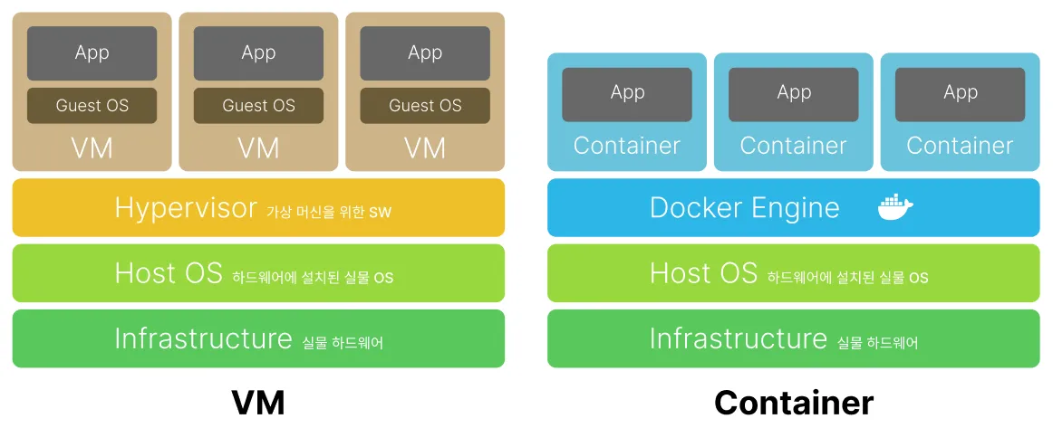 컨테이너는 가상화 기술 중 하나입니다. 기존의 가상화(VM)는 하나의 기기에서 여러 개의 OS를 실행시키는 하드웨어 가상화 방식을 사용하였습니다. 컨테이너는 이와 달리 OS 수준에서 여러 개의 프로세스를 실행하는 방식을 사용합니다.