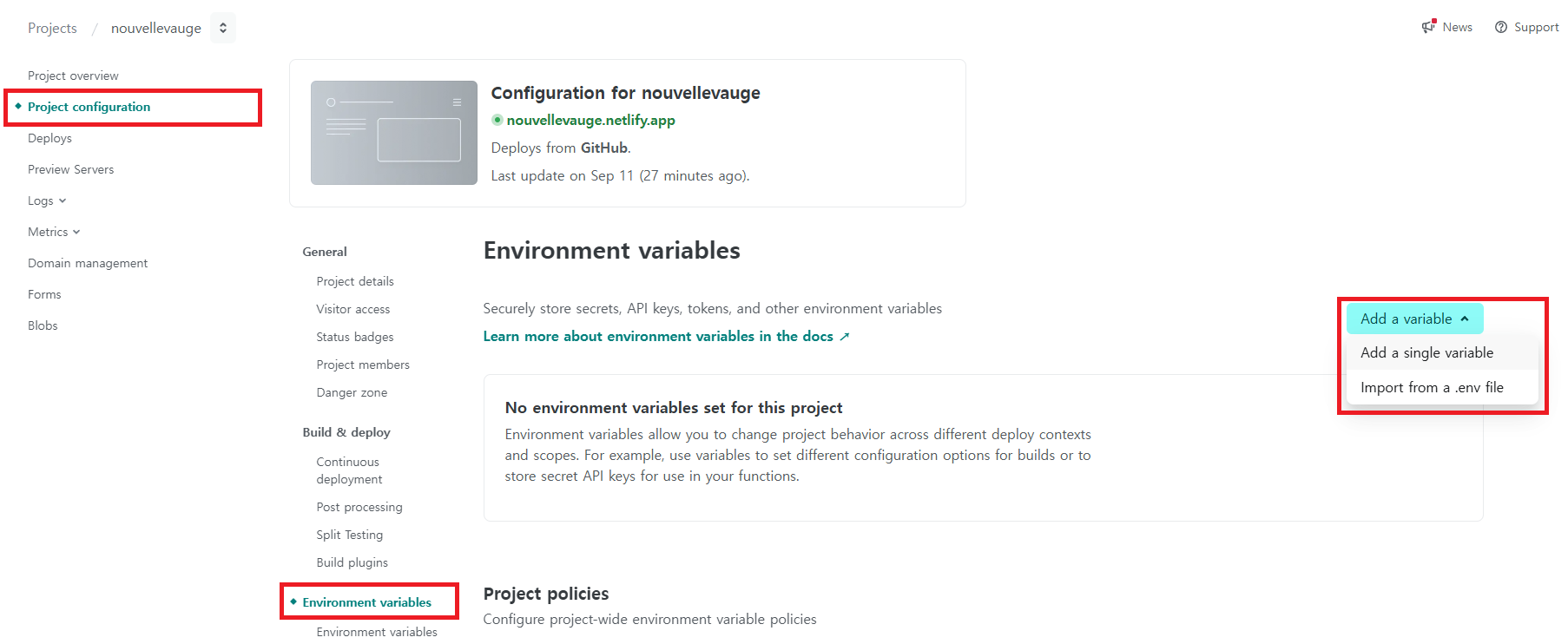 왼쪽 탭에서 Project configuration > Environment variables > Add a variable로 추가할 수 있습니다.