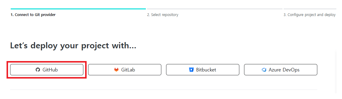 여기서는 Github를 선택합니다. 만약 다른 서비스에 저장소가 있다면 해당 서비스를 선택합니다.