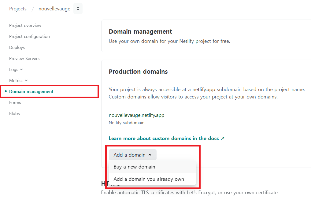 혹은 왼쪽 탭에서 Domain managment > Production domains > Add a domain > Buy a new domain으로 들어갈 수도 있습니다.