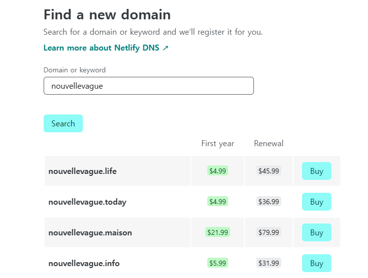 그 다음 이런 식으로 원하는 키워드를 입력해 검색하면 현재 구매 가능한 도메인들을 볼 수 있습니다.
