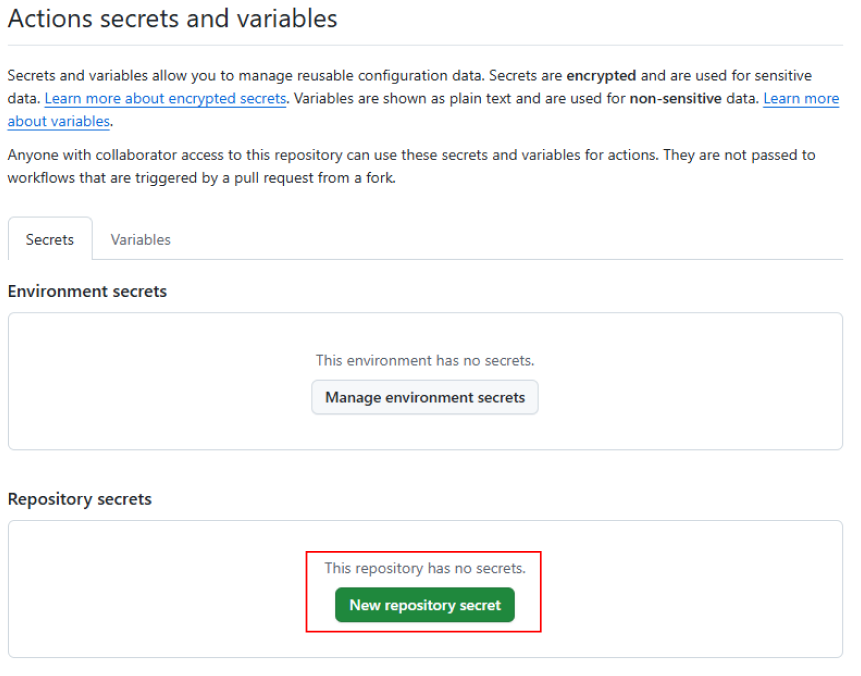 Github 저장소의 Settings > Secrets and variables > Actions 탭으로 들어가 New repository serect으로 새로운 secret을 등록해줍니다.