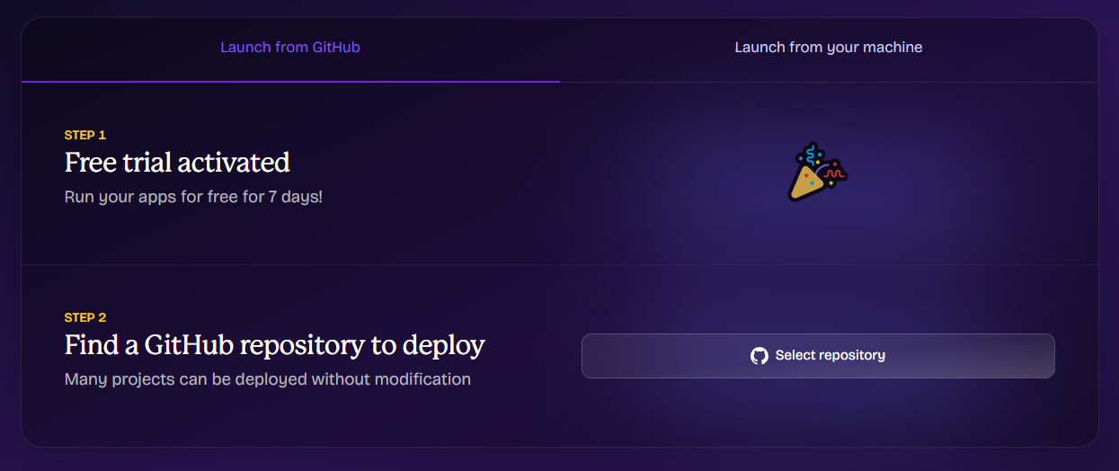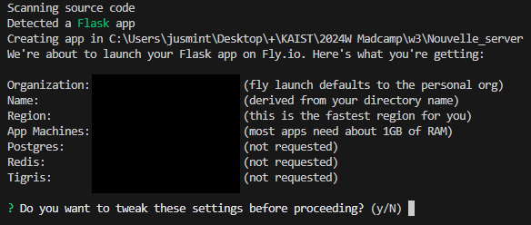 Y로 계속 진행하면, 새로운 브라우저 창이 뜨면서 배포 설정을 할 수 있는 fly.io 페이지가 나오게 됩니다.