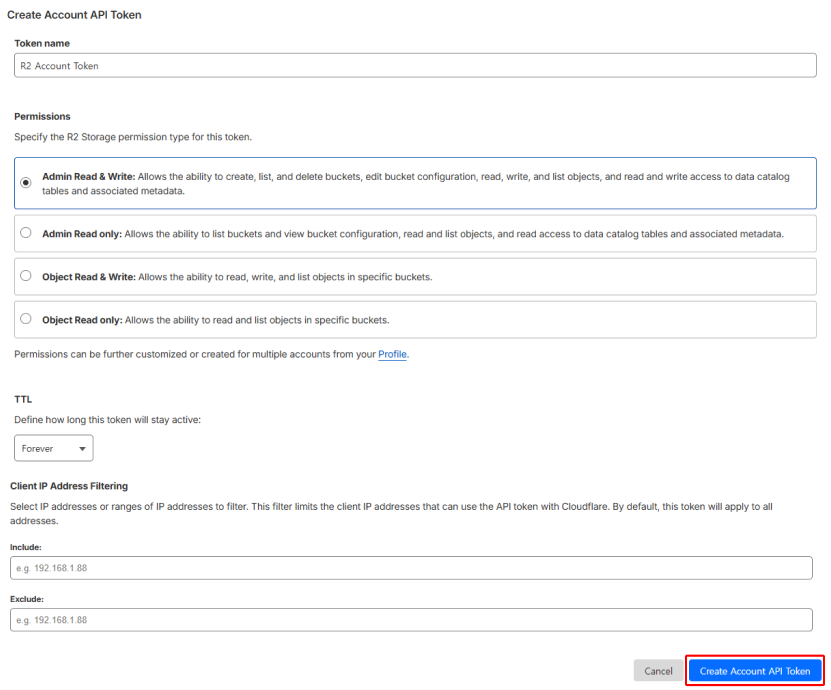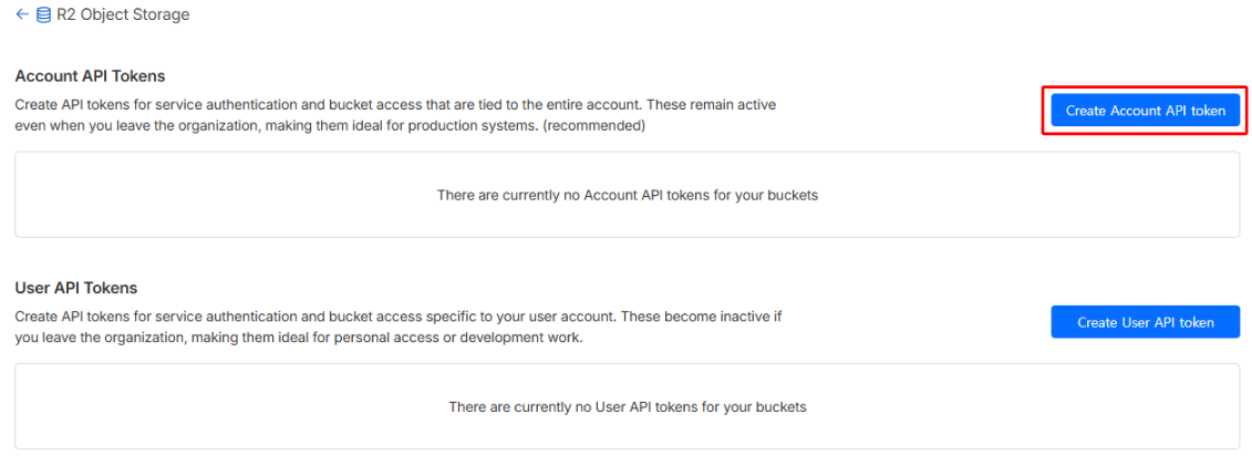 API 토큰에는 두 종류가 있습니다. 클라이언트 쪽의 사용자가 접근할 때는 User API, 그 외 서버 등에서 자동으로 접근할 때는 Account API 토큰이 필요합니다. 여기서는 서버가 R2에 접근한다고 가정하고 Account API 토큰을 발급합니다.