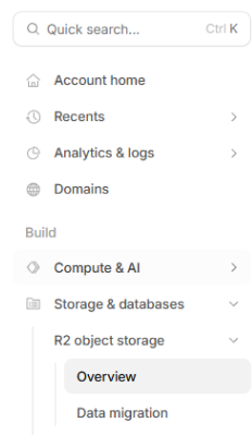 대시보드의 좌측 탭에서 Storage & databases > R2 object storage > Overview 로 들어갑니다.