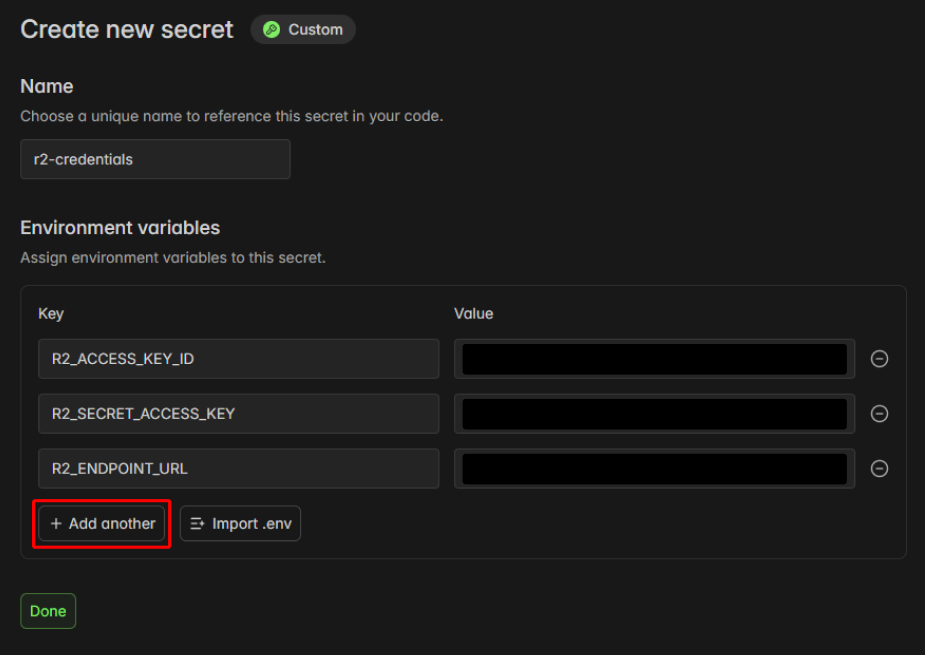 Name에 전체 Secret 이름을 입력한 후, Enrionment variables에서 환경 변수들을 등록해주면 됩니다. 여기서는 r2-credentials라는 이름의 Secret을 생성했고, 그 안에 R2-ACCESS_KEY_ID, R2_SECRET_ACCESS_KEY, R2_ENDPOINT_URL 세 가지의 환경 변수를 등록했습니다.
