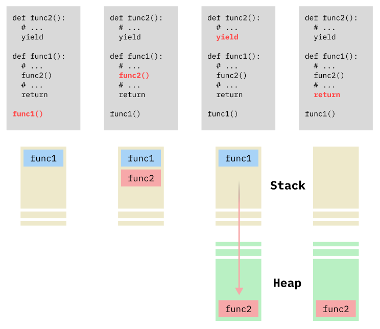 반면 yield를 통해 함수가 종료된다면 스택 프레임이 완전히 사라지는 대신 그 값들이 힙(Heap) 영역으로 이동해 저장됩니다. 저장되는 값으로는 코드가 실행된 지점, 그 시점에 각 변수들에 저장되어 있던 값 등이 있습니다.