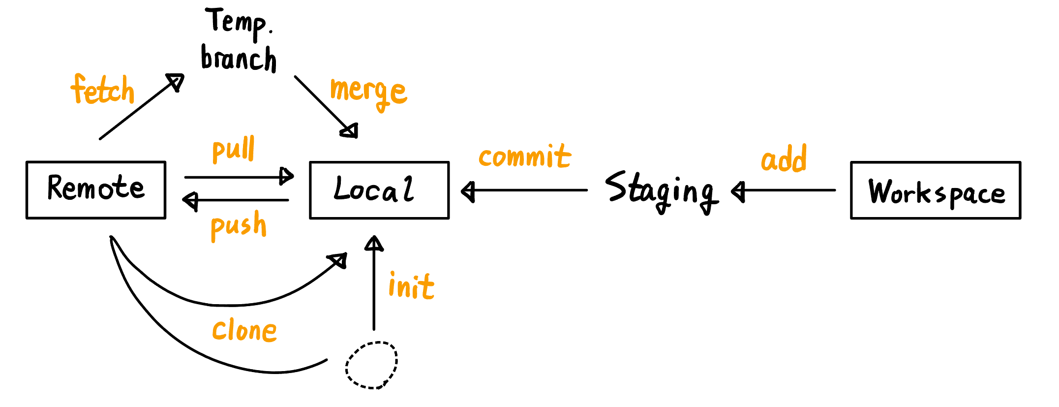 | Pull | Fetch + Merge Remote 저장소를 가져와 Local 저장소와 합칩니다. |