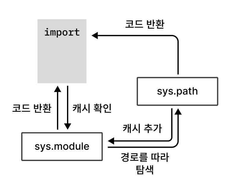 import를 통해 가져오는 코드들도 caching의 대상이 될 수 있습니다. 만약 처음 import 하는 모듈(또는 패키지)라면, sys.path를 참고하여 해당 모듈이 위치한 경로를 따라 코드를 가져옵니다. 첫 import가 완료되면, sys.module라는 dictionary 객체에 해당 모듈 코드를 저장합니다. 이후에 같은 모듈을 import 하면, sys.module에서 그 모듈이 존재하는지 확인합니다. 존재한다면 저장된 객체 주소를 불러와 사용합니다.