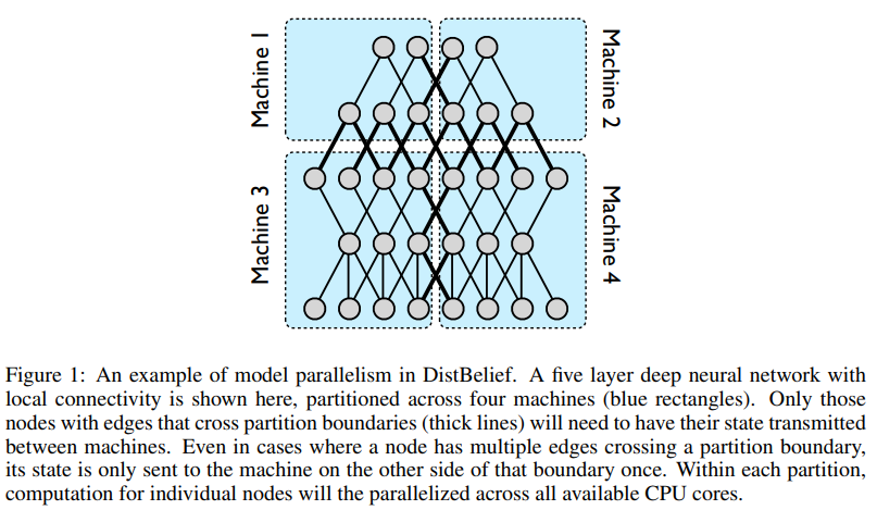 대규모 딥러닝 모델의 빠른 학습을 위해 이 논문은 DistBelif라는 SW 프레임워크를 개발했습니다. DistBelif는 신경망과 layered graphical model에서 분산계산을 적용할 수 있도록 도와줍니다. 사용자는 각 layer의 모드마다 어떤 계산을 할 것인지, 그리고 계산을 수행할 때 어떤 메세지를 전달할 것인지를 지정합니다. 대규모 모델에서는 모델을 몇 개의 구간으로 나눠 가 장치에 할당되도록 해야 합니다(Figure 1).