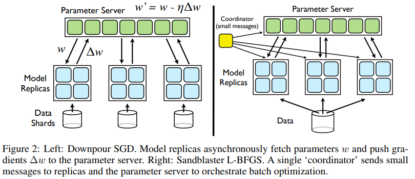 기존의 SGD는 순차적 처리로 인해 많은 양의 데이터셋을 처리하기 비효율적이었습니다. 이 논문은 큰 데이터셋에서의 처리를 위해 downpour SGD를 도입했습니다. 이는 여러 복제본을 사용하는 비동기적 SGD로, 데이터셋을 각 부분으로 나누어 각각의 복제본 모델에서 실행하게 됩니다. 이 모델들은 매개변수 상태를기록하는 중앙 매개변수 서버를 통해 갱신사항을 공유하게 됩니다. 매개변수 서버는 여러 장치들이 매개변수 값을 분담하여 기록하는 형태로 구성되어 있습니다(Figure 2). 매개변수 서버를 포함한 각 복제본 모델들이 다른 모델들과 별개로 작동하기 때문에, 이 방식은 비동기적이라고 할 수 있습니다.