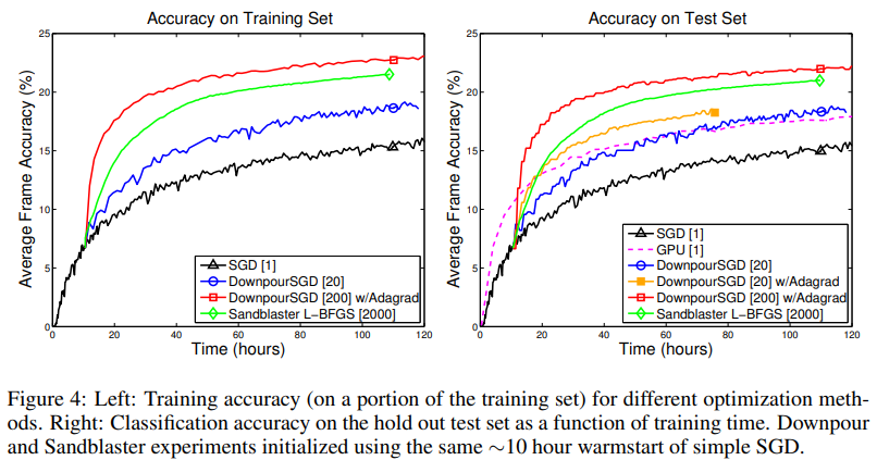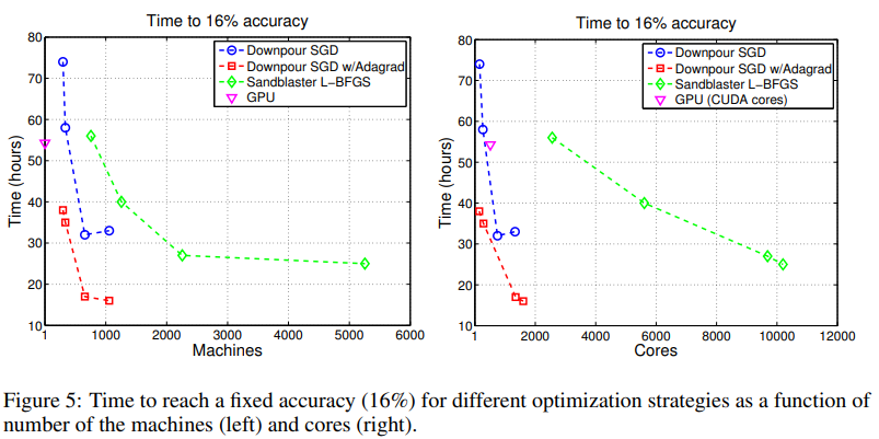 가장 빠른 것은 200개의 모델 복제본을 사용한 Downpour SGD + Adagrad(빨간색)입니다. 만약 충분한 CPU 리소스에 액세스할 경우, Sandblaster L-BFGS 와 Downpou SGD + Adagrad는 고성능 GPU보다 훨씬 빠르게 모델을 학습시킬 수 있음을 보여주었습니다.