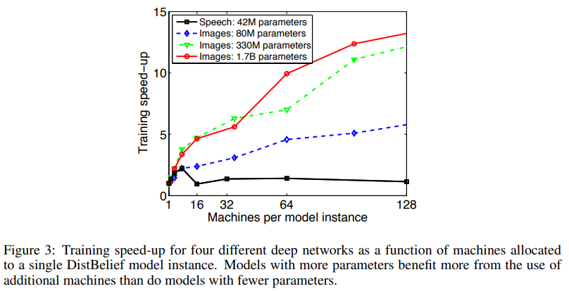 DistBelif의 병렬계산을 평가하기 위한 것으로, 사용하는 장치의 수에 따라 미니배치 하나를 처리하는데 걸리는 평균 시간을 측정했습니다. Figure 3.은 사용 장치 수에 따른 계산 결과를 speedup을 통해 나타낸 것입니다. Speech task의 경우 8개 장치 이상으로는 network overhead로 인해 학습이 느려지는 것을 볼 수 있습니다. 이에 반해 local connectiviy가 강한 image task의 경우 장치가 많아질 수록 speedup도 증가함을 볼 수 있습니다.