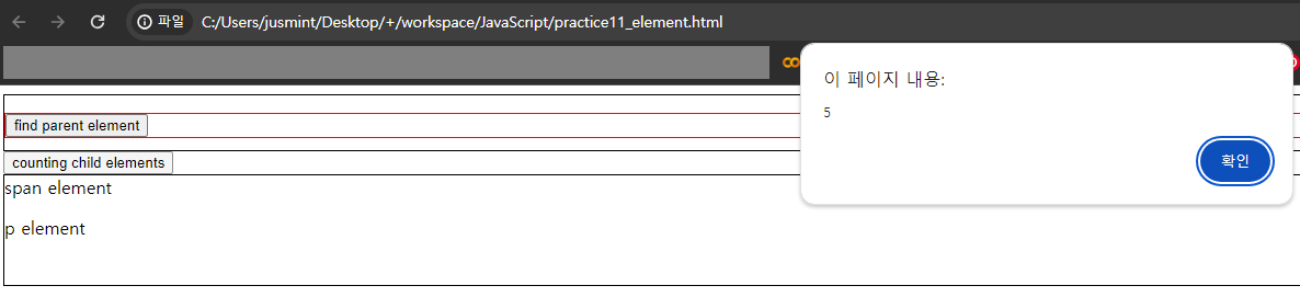 element를 id로 하는 요소의 자식 요소 개수를 알림창으로 띄우는 함수 countChildren()에 대한 코드입니다.