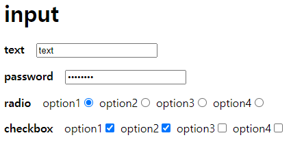 | <input type="password" /> | 줄 바꿈 없고 문자가 표시되지 않는 입력 |