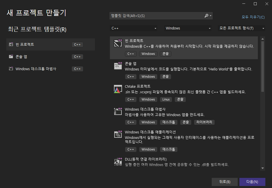 2. 새 프로젝트 만들기(N) > C++ 빈 프로젝트를 선택합니다.