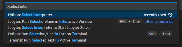 Ctrl + Shift + p 를 눌러 명령 팔레트를 열고 Python: Select Interpreter 를 검색합니다.